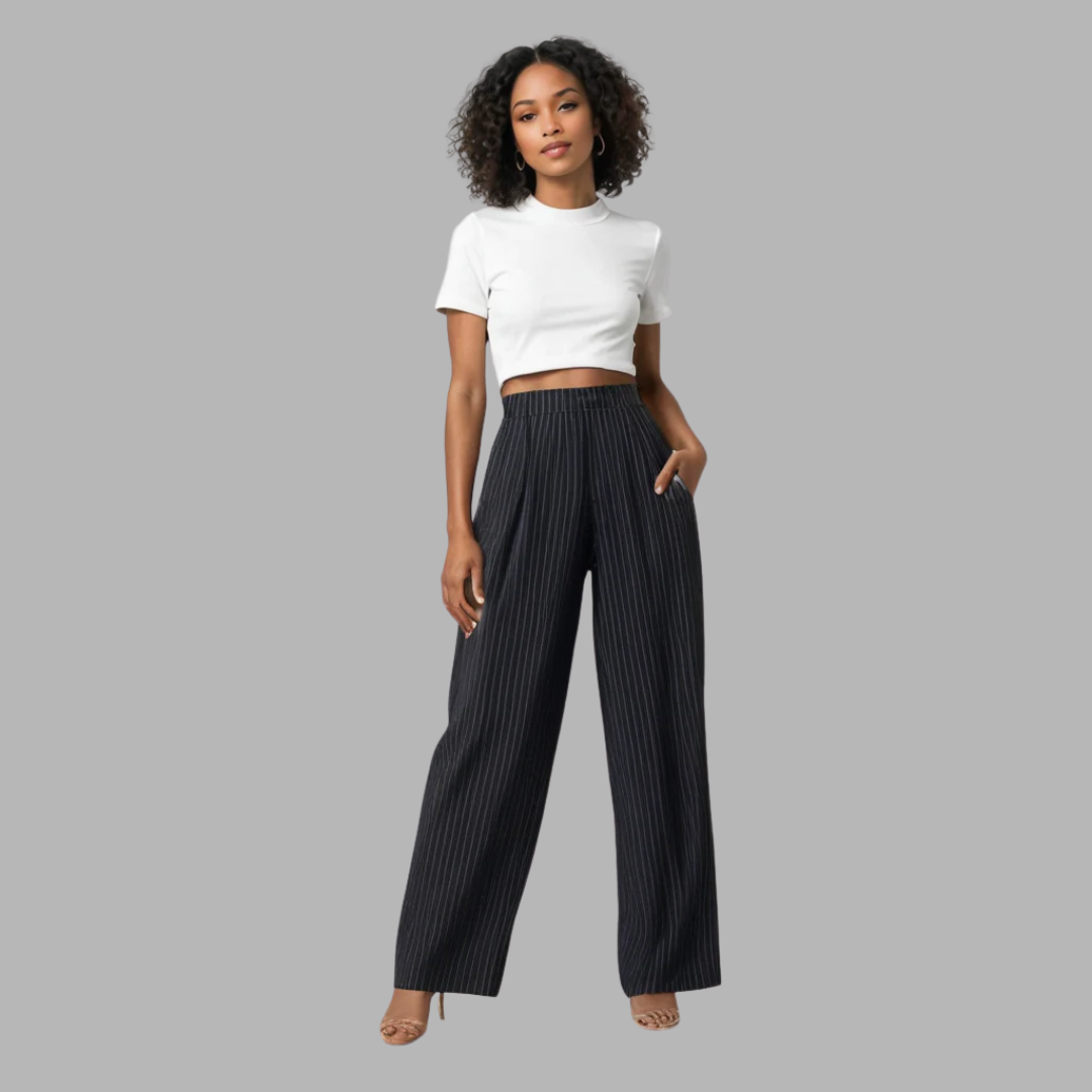 En tidløs nødvendighet for absolutt eleganse! Disse svarte buksene med fine striper kombinerer sofistikasjon og komfort for et strukturert og moderne utseende.